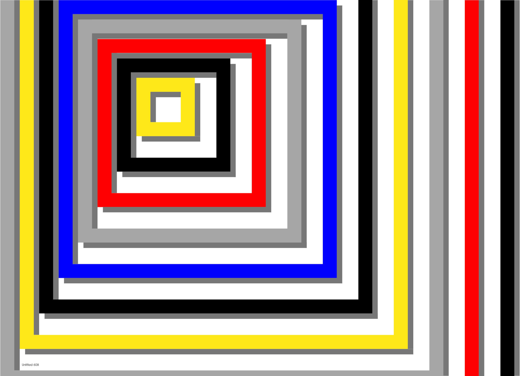 Vanuit het centrum bewegen kleurvlakken en grijstinten in strakke vierkante contouren naar buiten, als een spel van terugkerende motieven.