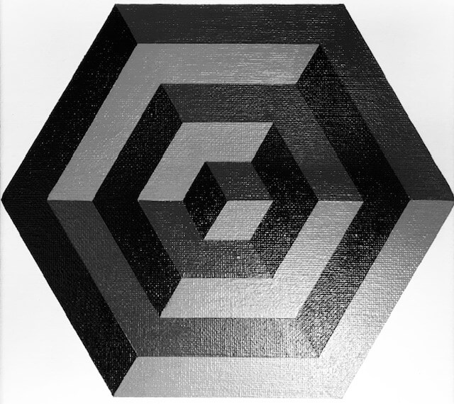 De afwisseling van zwart en grijstinten in trapsgewijs geplaatste segmenten wekt een optische illusie van diepte en beweging op , alsof de kijker wordt meegezogen naar een centraal punt.