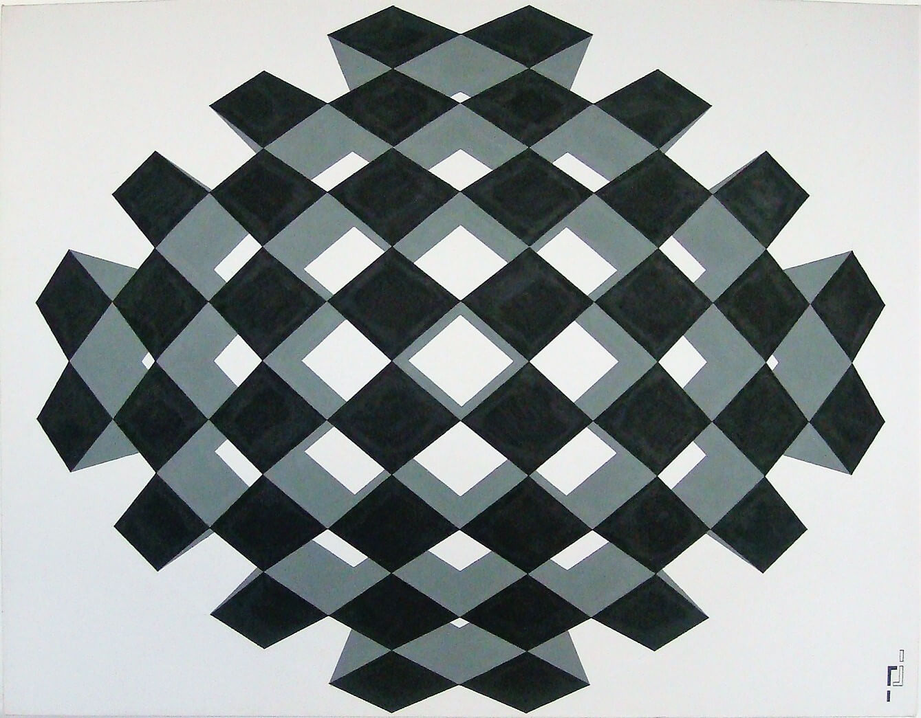 De herhaling van ruiten en subtiele grijze schaduwen versterken dat ruimtelijke effect, waardoor het lijkt alsof de vormen zich naar buiten toe ontvouwen.