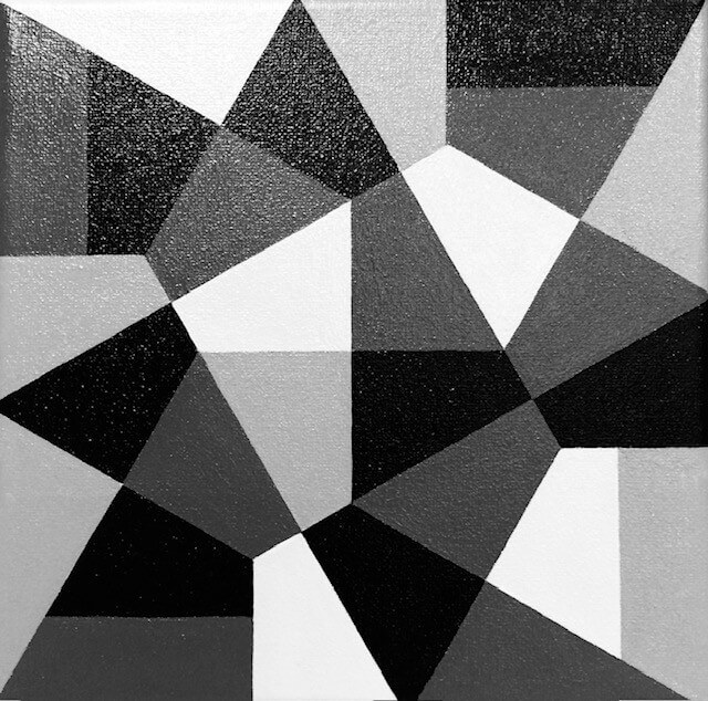 Dit schilderij toont een complex spel van scherpe vlakken en diagonale lijnen in een monochroom palet van zwart, wit en grijs.