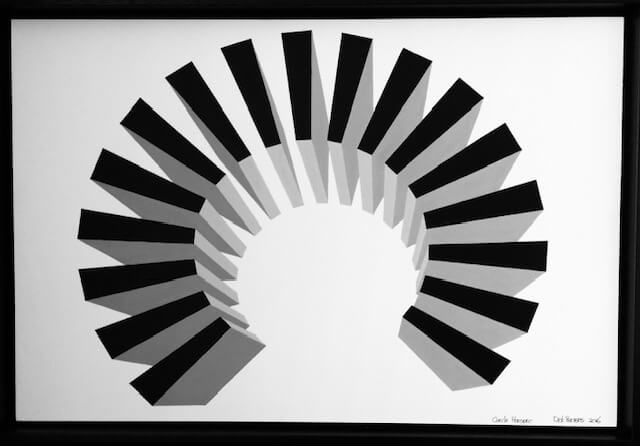 De blokken lijken bijna driedimensionaal te kantelen en vormen samen een optische illusie van een cirkel zonder daadwerkelijk gebogen lijnen te gebruiken.