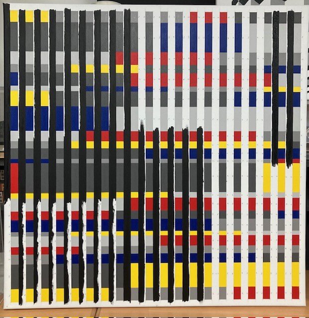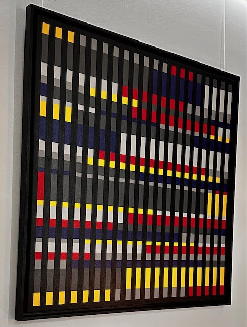 De zwarte verticale balken gevenstructuur en regelmaat, terwijl de felle kleuren als noten op een onzichtbare partituur lijken te verschijnen.