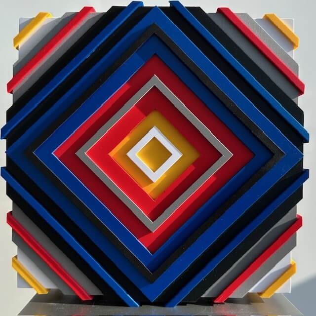 De centrale vierkanten lijken zich als een optische illusie in de diepte of juist naar voren te bewegen, wat zorgt voor een sterk ruimtelijk effect.