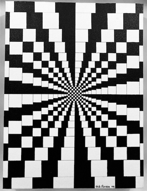 Dit schilderij heeft een sterk optisch effect, waarbij de afwisselende zwart-witte vierkanten zich vanuit een centraal punt naar buiten uitbreiden.
