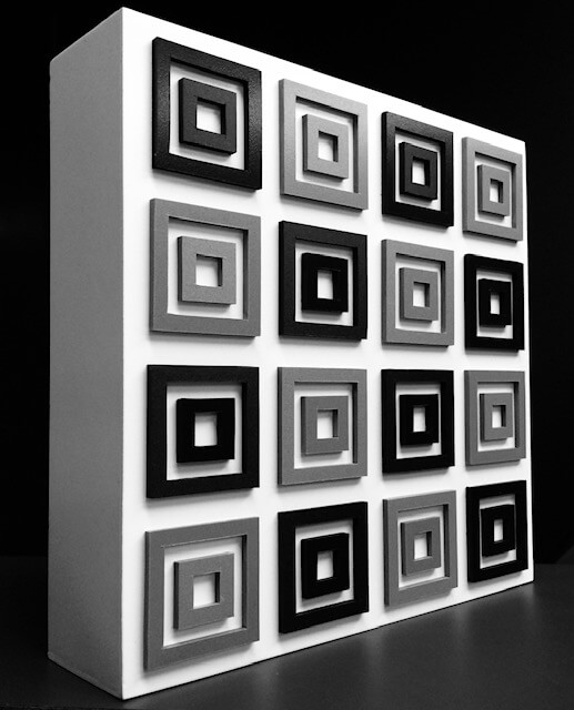 Deze 3D werken vormen samen een visueel drieluik rond herhaling, ritme en optisch evenwicht.