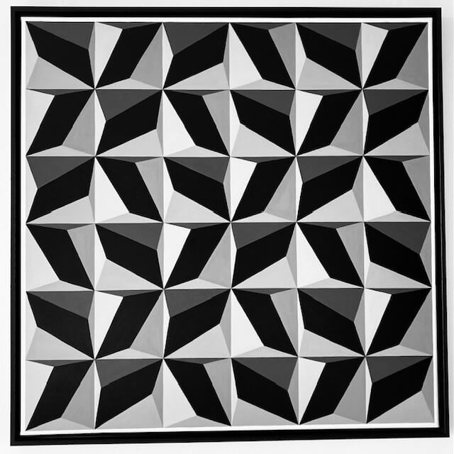 Dit schilderij creëert een optische illusie van driedimensionaliteit door een patroon van geometrische vormen in zwart, wit en grijstinten.