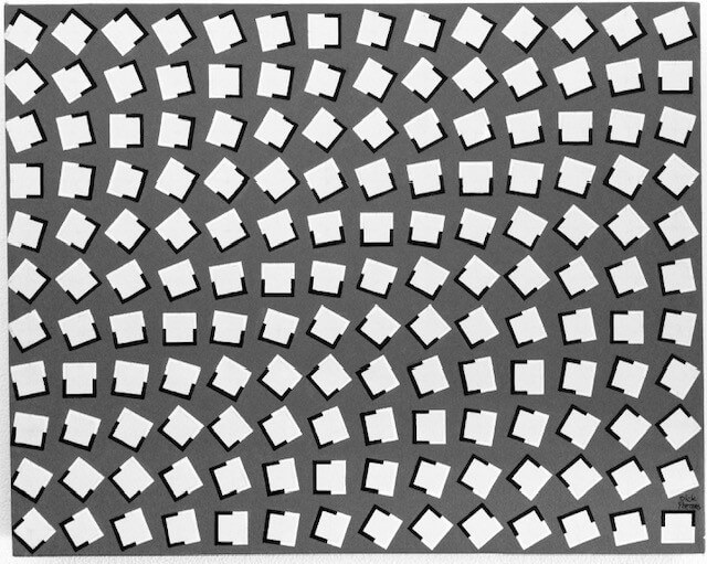 De lichte kanteling van elk vierkant en het slimme leurcontrast tussen zwart, wit en grijs zorgen voor een illusie van beweging.