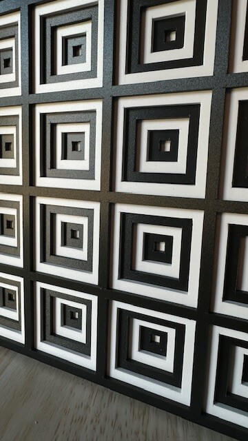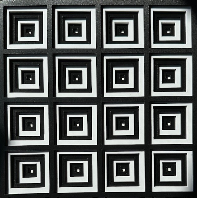 Elk element toont een reeks in elkaar vallende vierkanten in zwart en wit, die verdiept zijn aangebracht en zo een optisch spel van perspectief en diepte creëren.