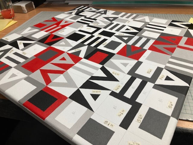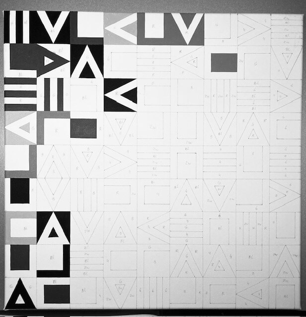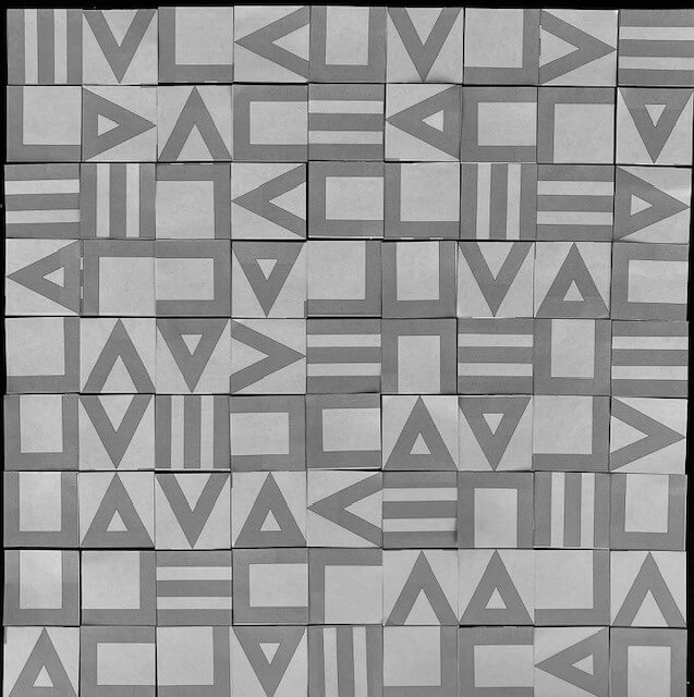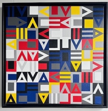 De geometrische vormen - driehoeken, strepen en vierkanten - lijken letters of symbolen te vormen, alsof er een verborgen boodschap in schuilt.