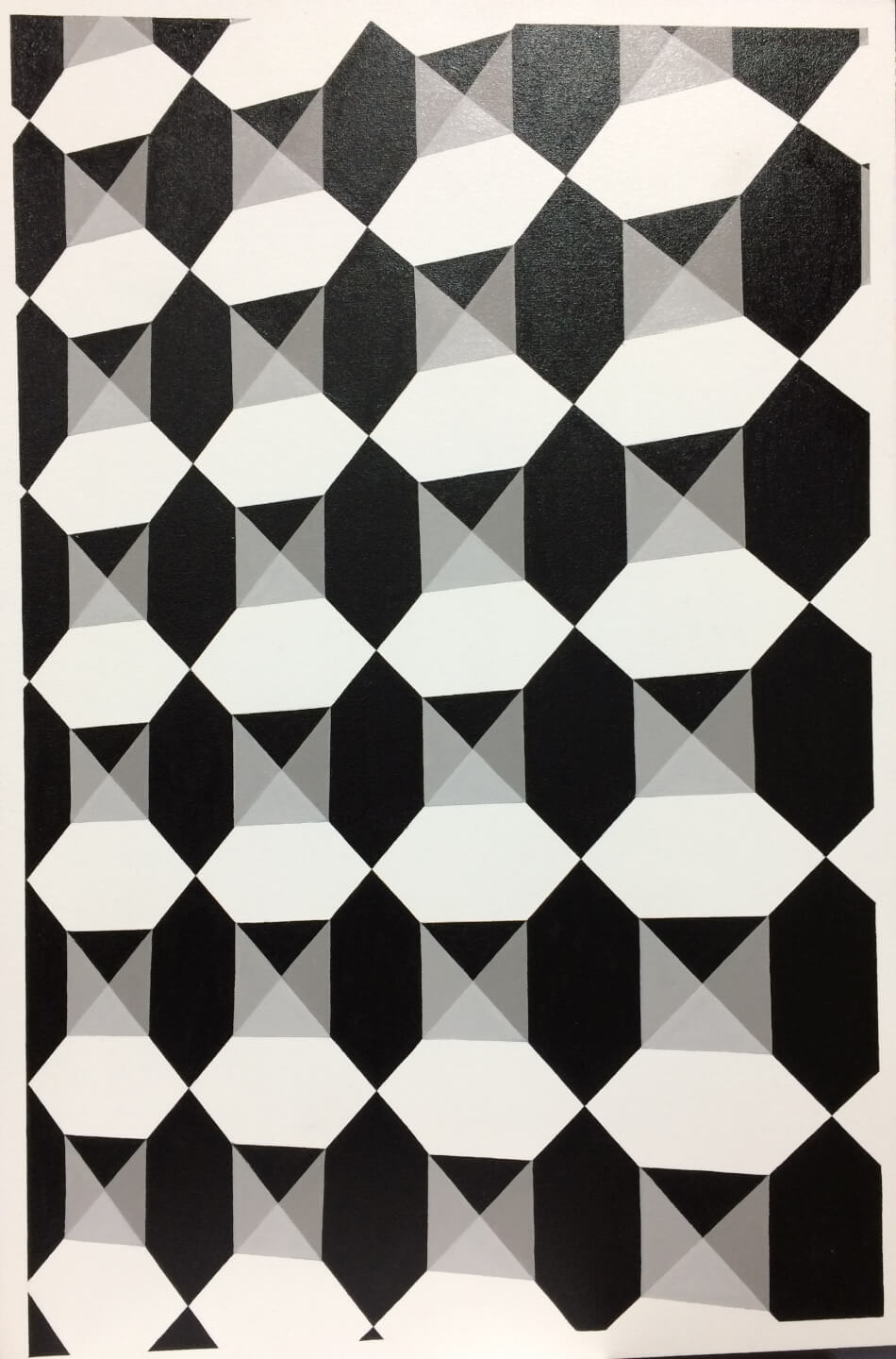 Dit schilderij speelt met perspectief en visuele diepte door een herhalend patroon van zwart-witte vormen met grijze schaduwen.