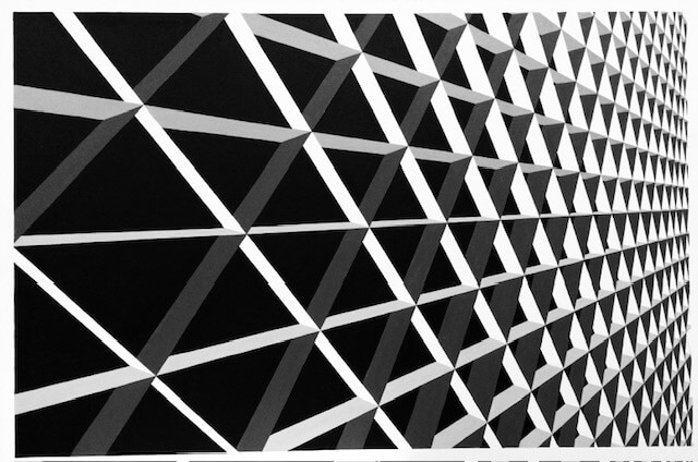De schuine invalshoek en het perspectief versterken de suggestie van diepte, alsof je tegen een architectonische gevel of een driedimensionale constructie aankijkt.