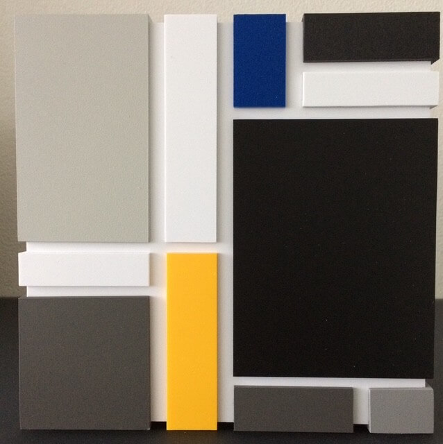 Het strakke ritme van de vlakken doet denken aan een moderne stad waarin architectuur en kleur hun eigen rol opeisen.