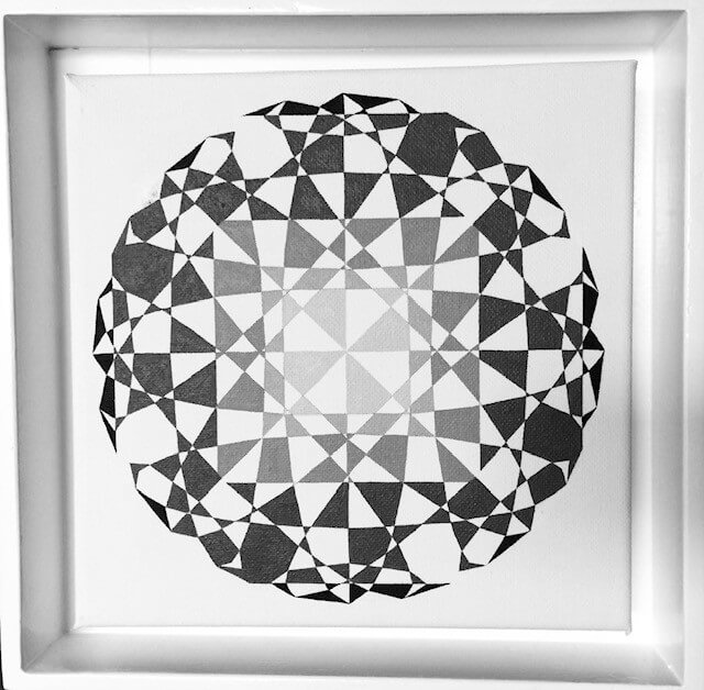De centrale driehoeken in zwart-wit creëren een hypnotiserend effect dat de blik naar binnen trekt.