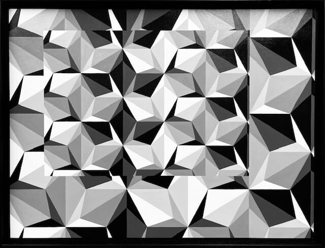 De grijstinten en scherpe contrasten creëren een diepte-effect, waardoor de vormen lijken te bewegen en uit het vlak te springen.