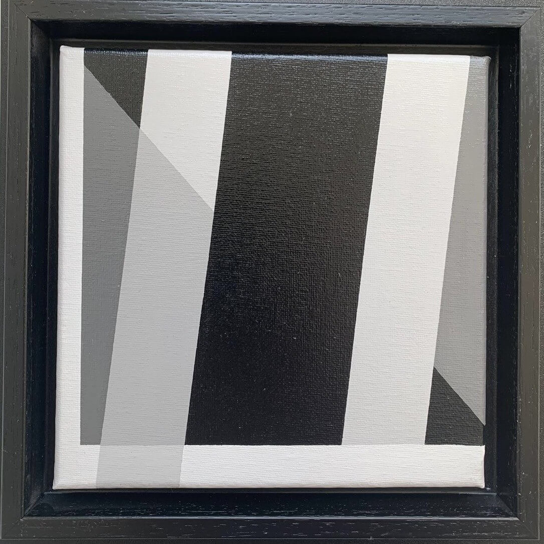 De compositie is krachtig en gebalanceerd, met ritmische herhalingen en subtiele transparanties die doen denken aan schaduwen op een architectonisch oppervlak.