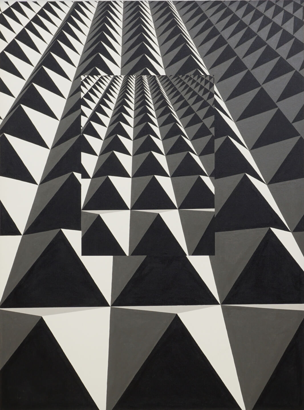 Dit schilderij toont een adembenemend landschap van zwart-witte piramidevormen die in een oneindig perspectief lijken te verdwijnen.