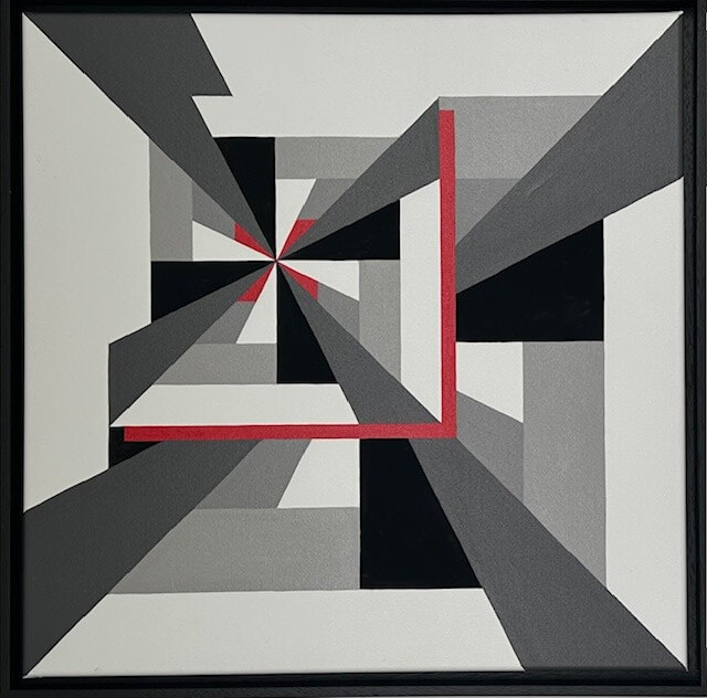 De rode vorm houdt de compositie in balans - als een anker dat structuur brengt te midden van optische beweging.