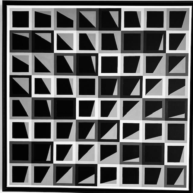 Dit is een strak geometrisch patroon waarin zwarte vierkanten en grijstinten een intrigerend visueel effect creëren.