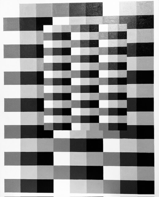 Het centrale gebied, met een fijner raster van afwisselende lichte en donkere vierkanten, lijkt bijna te zweven boven de bredere, meer gestreepte achtergrond.;