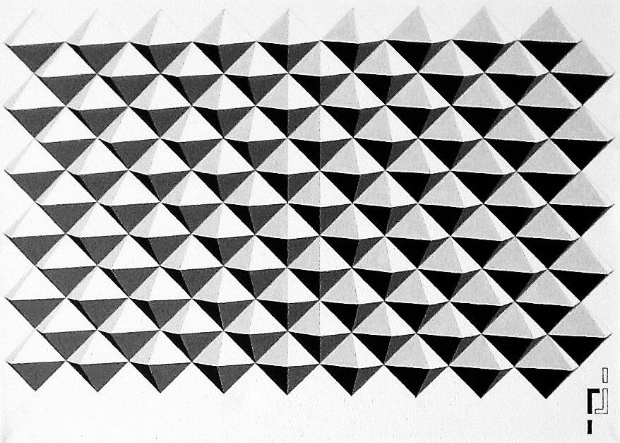 De herhaling van de driehoeken en de subtiele schaduwwerking geven het een driedimensionale illusie, alsof het een reliëf heeft of gevouwen oppervlak is.