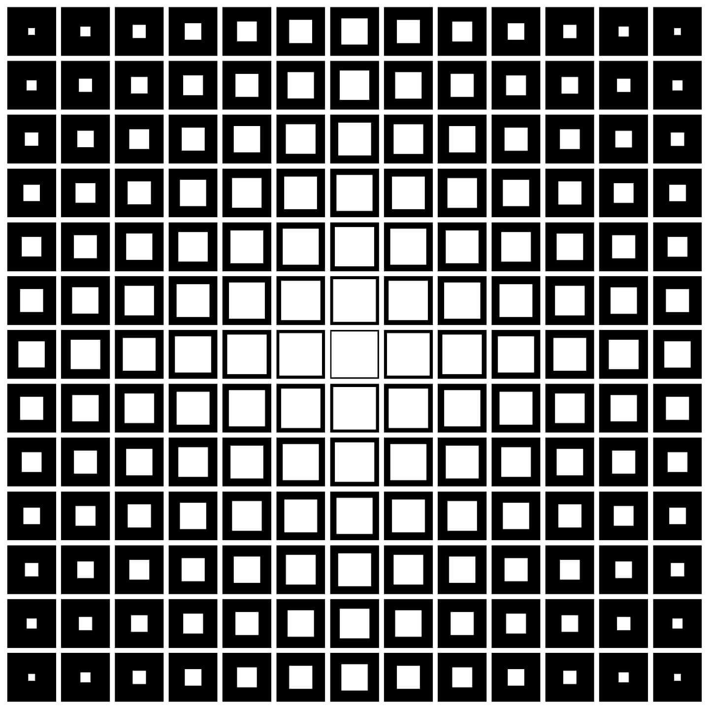 In dit driedimensionale werk zijn uit zwarte vierkante blokken kleinere vierkanten gesneden en in verschillende groottes op een witte ondergrond geplaatst.