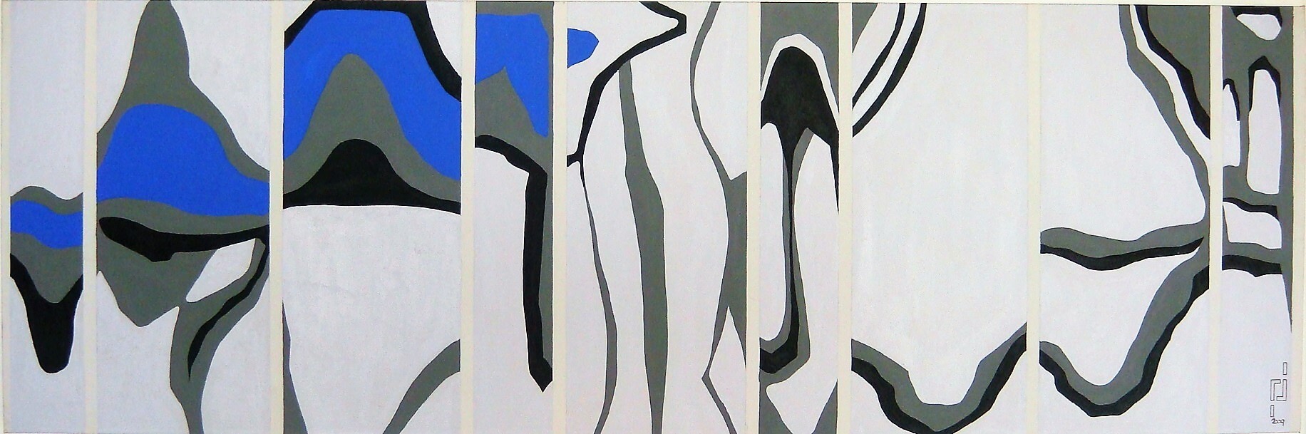 Dit schilderij bestaat uit een serie panelen waarin organische vormen in grijs, zwart en helder blauw zich als vervormde reflecties tonen.