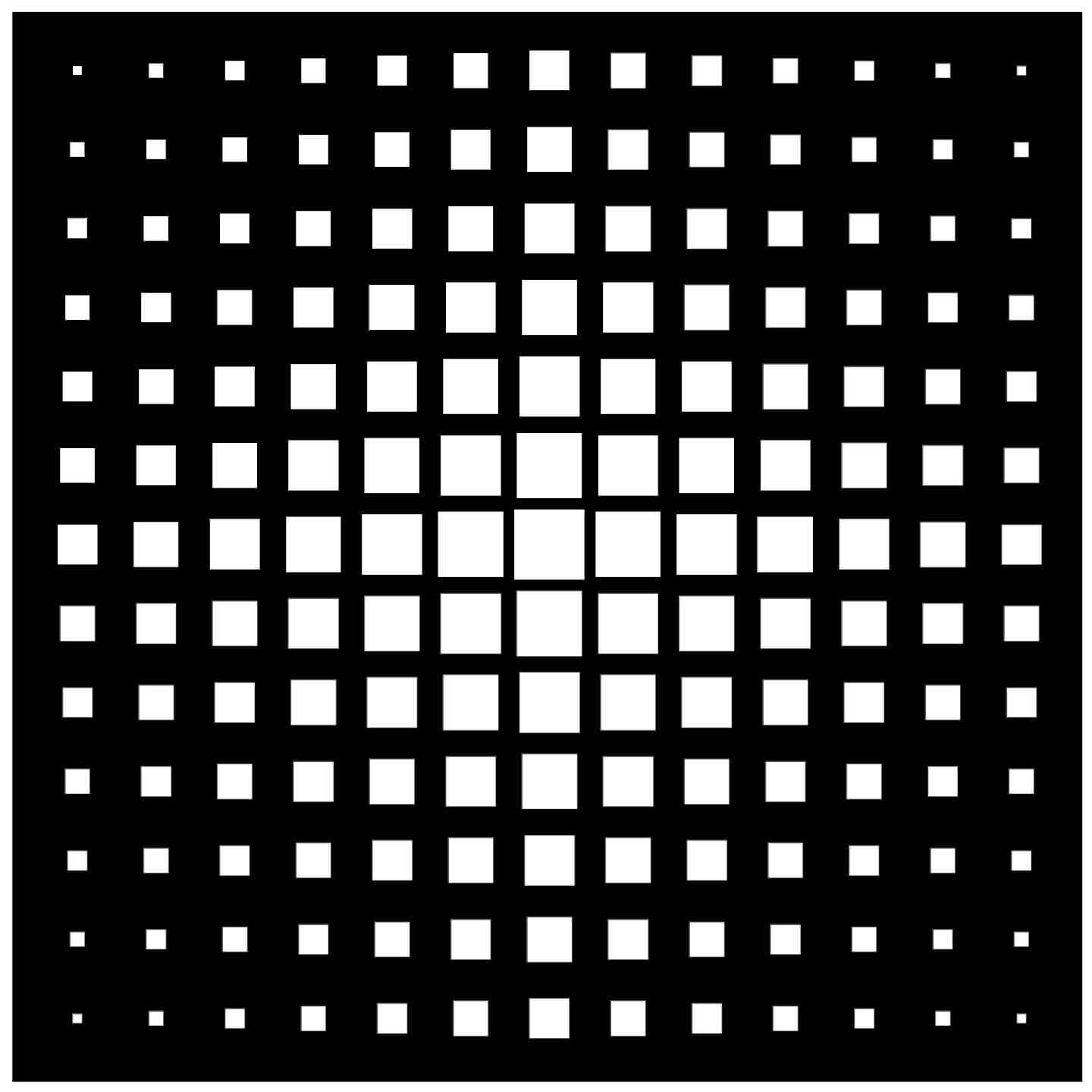 In dit driedimensionale werk vormt een raster van witte vierkante elementen een geconcentreerd zwaartepunt in het midden.